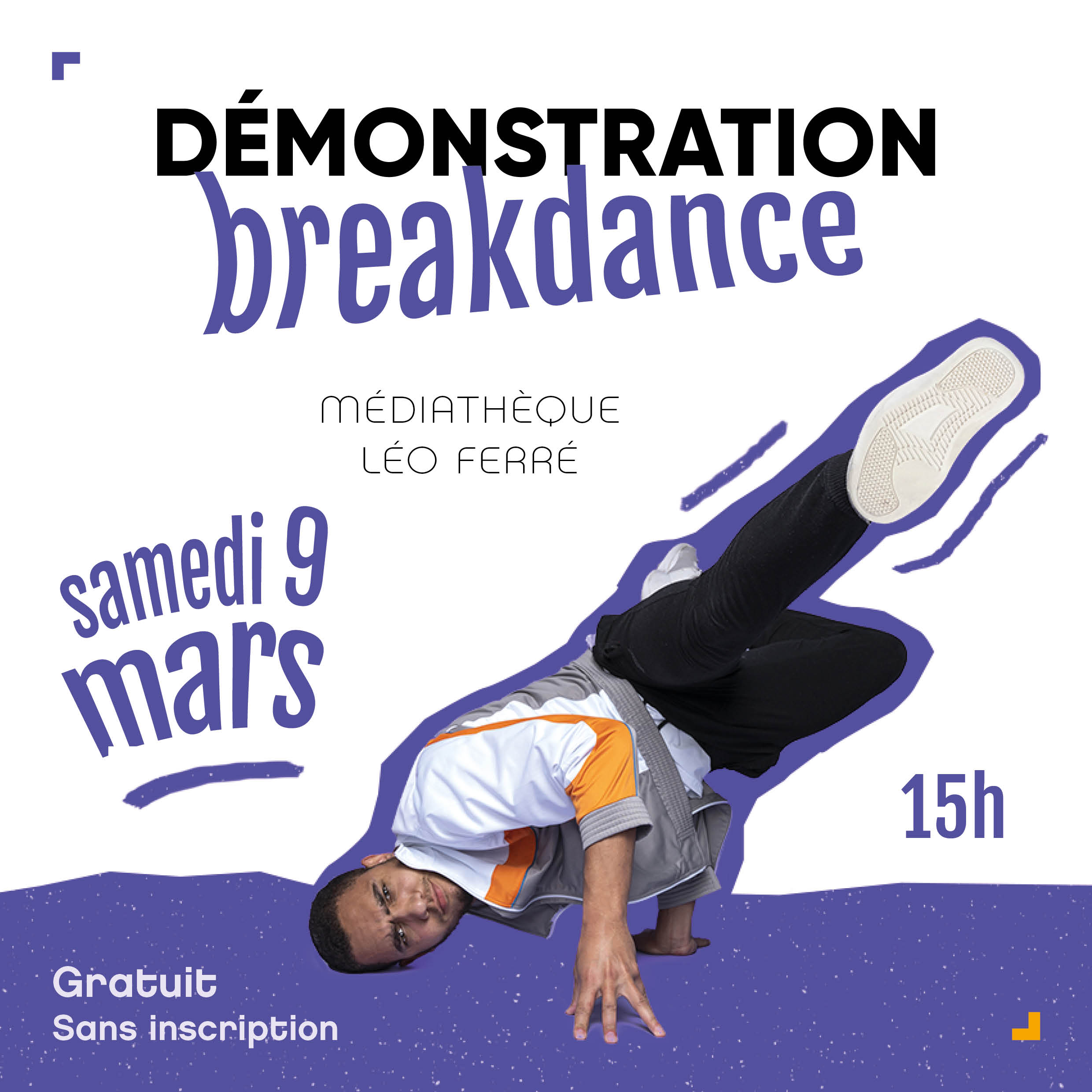 Le SAMEDI 9 MARS à 15h, rendez-vous à la médiathèque Léo Ferré pour assister à une démonstration de break dance. C’est une excellente opportunité de soutenir de jeunes danseurs passionnés.