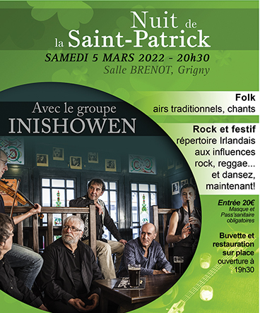 Nuit de la Saint Patrick organisée par les Vigilantes animée par le groupe Inishowen, répertoire Irlandais aux influences rock, reggae…