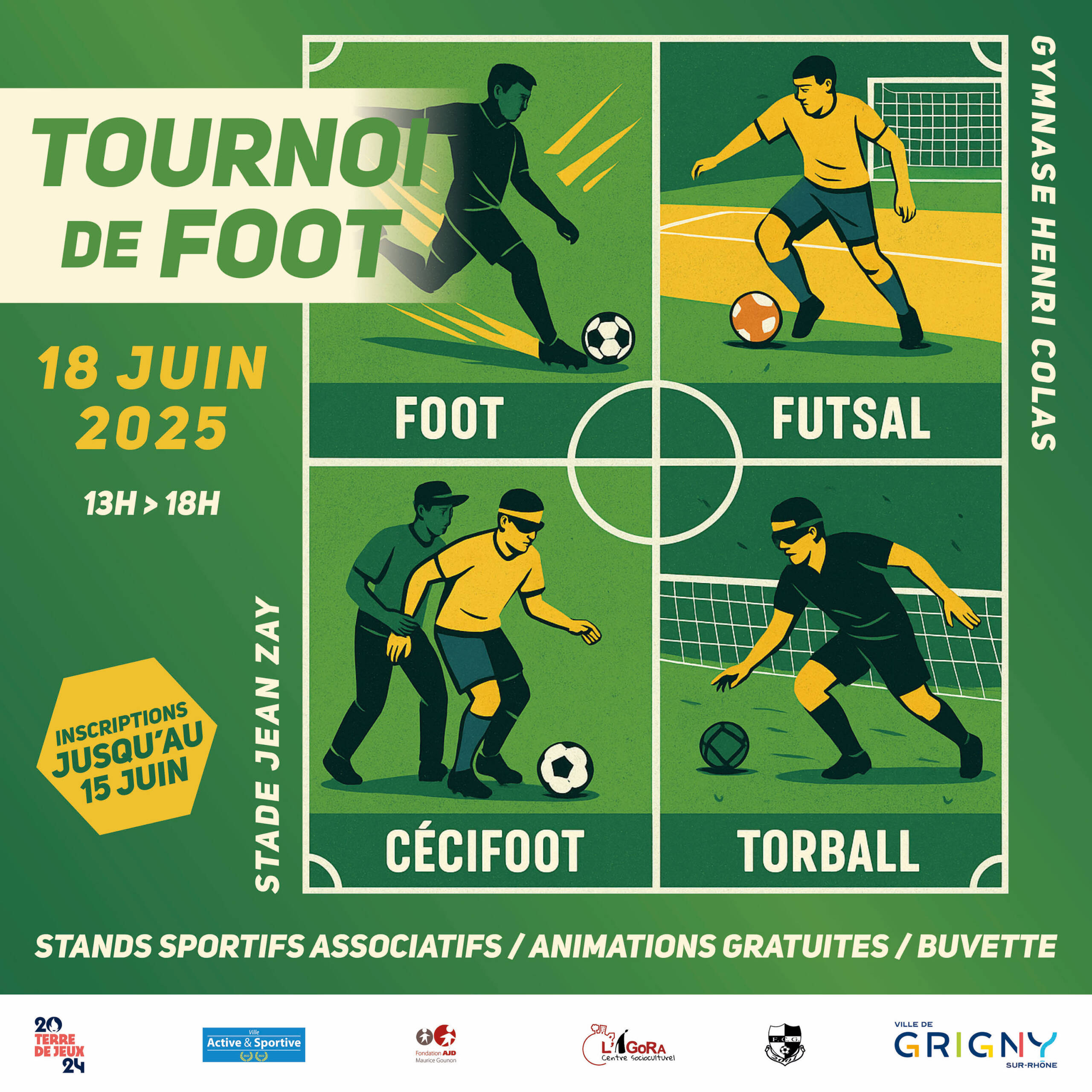 La Ville de Grigny-sur-Rhône, en partenariat avec le Football Club de Grigny, organise un tournoi de football le mercredi 18 juin 2025 de 13h à 18h au Stade Jean Zay et au Gymnase Henri Colas.